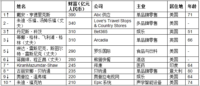 前十名平均财富496亿元,平均涨幅为14%,去年前十名平均涨幅达到95%。胡润表示:“前十名中周群飞和张茵财富缩水较多,中美贸易摩擦对她们有一定影响。”前十名门槛比去年降低4%,为270亿元。