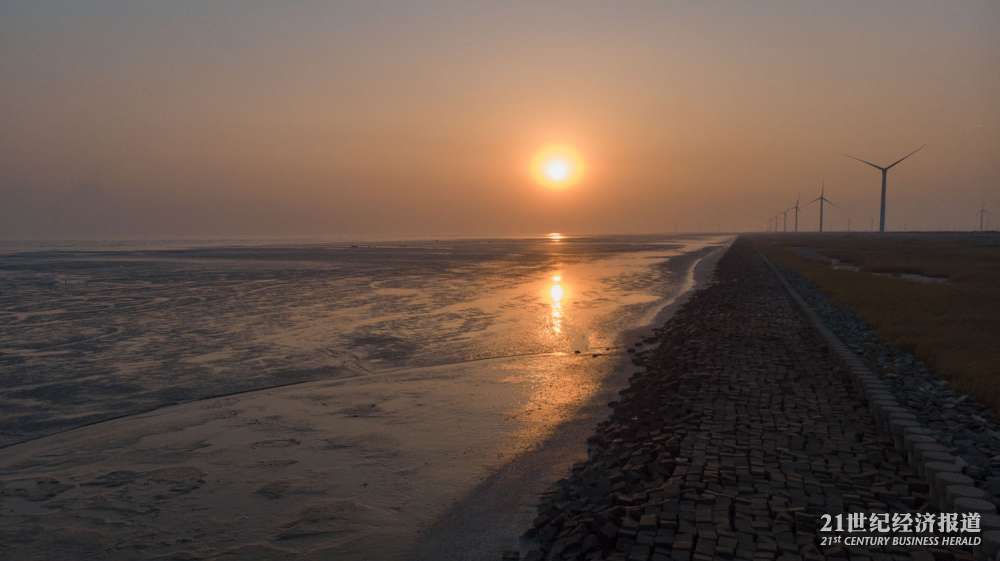 陈家港自然资源丰富,可利用荒地5万亩以上,并连接潮上带44万亩,潮间带120万亩,潮下带160万亩的广袤滩涂,且每年还以5万亩成陆速度发展。(图为日出下的陈家港沿海退潮后的滩涂)