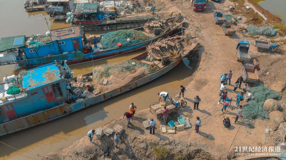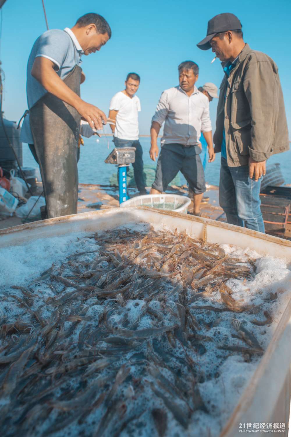 由于陈家港地区大型工业的迁入,许多的原住民已经放弃了靠海吃饭而走进了工厂,成为了产业工人。而仍有部分人则继续干着祖辈的行当。(图为养殖场工人们将打捞的虾运上岸)