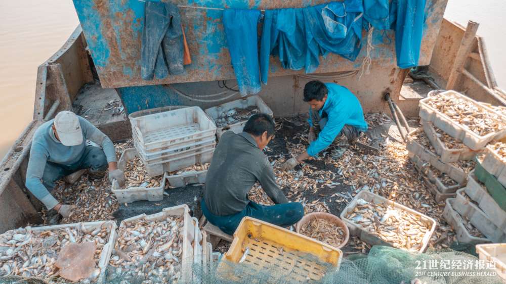 季广东和他的兄弟经营着这条渔船,目前聘了三位船员一起出海,按照他们船只的标准,应该配备共八位船员,但很多渔民不想出海,因为出海捕鱼风险大且辛苦,即使每月有7000元的薪水,也没人愿意干。(图为船员分拣打捞的海产品)
