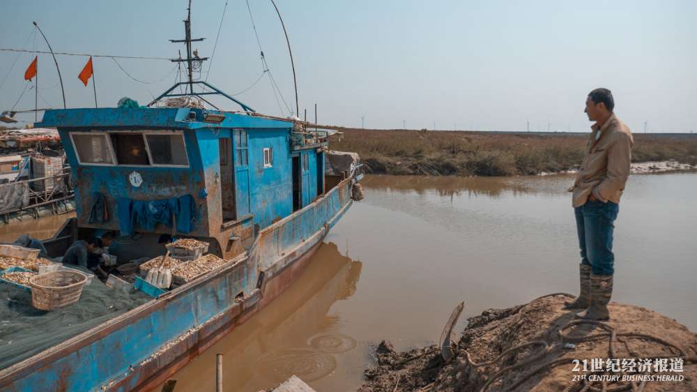 除了捕鱼以外,季老大还接了上海电气风力海上发电机的维修运输业务,要不然,一条船每月出海的成本是4万多开销,册布小呀(“吃不消”本地话)。(图为季老大停靠的陈家港三号渔垛)