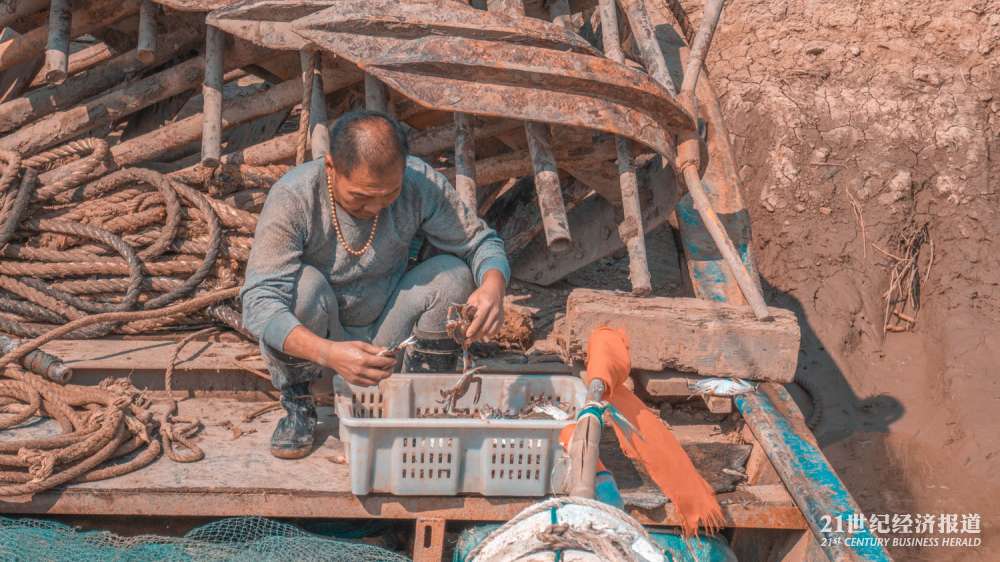 风尘仆仆的船老大季广东,分拣着刚打捞回来的梭子蟹。