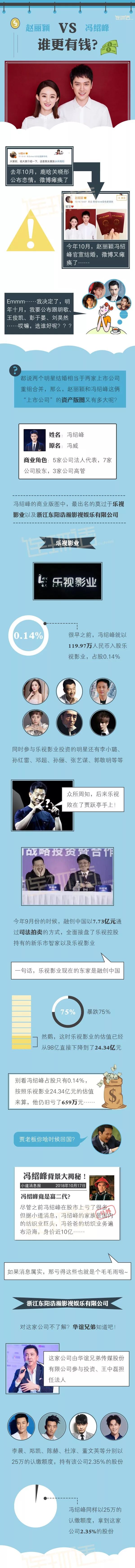 10月16日,赵丽颖冯绍峰在女方生日当天宣布结婚,消息引“爆”了微博和微信朋友圈。两人均为一线明星,与14家公司有股权关系,其中媒体公布女方2017年收入上亿,二人背后的商业图谱不容小觑。