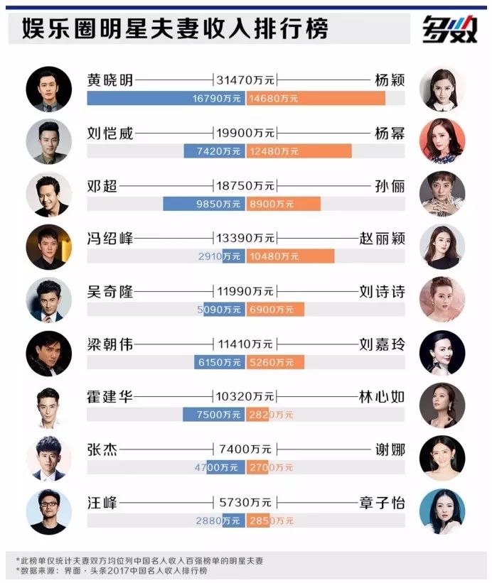根据福布斯中国名人榜,二人均出现在百强榜名单之内。其中,赵丽颖2016年7月至2017年6月的收入达到1.9亿元,冯绍峰期间的收入达到4000万元。