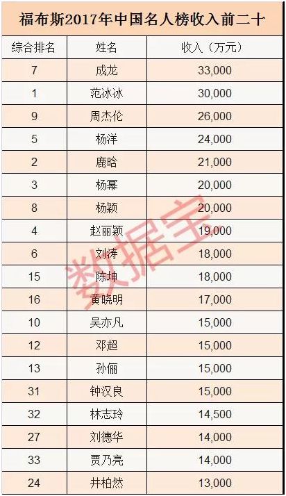 福布斯中国名人榜,主要从收入、曝光率、作品影响力等多个指标,对中国内地和港澳台名人,包括歌手、演员、主持人、导演、模特、运动员,但不包括商业名人、网络红人等进行综合排名。近期因偷税漏税被重罚的范xx连续五年霸榜,2016年7月至2017年6月间收入3亿人民币。综合排名第二的是鹿晗,收入2.1亿元,第三是杨幂,收入2亿元人民币。