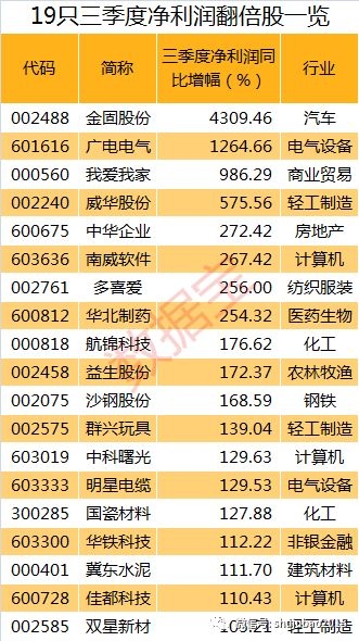 截至10月18日,沪深A股已有72家上市公司披露了三季度业绩,,其中19家上市公司净利润增幅翻倍。金固股份、广电电气两只个股三季度净利润增速更是超过10倍。