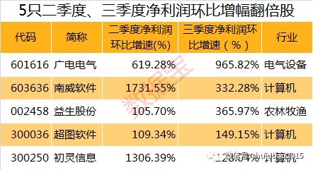 相比净利润同比增速,环比增速能更好地反映上市公司业绩的最新变化趋势。已公布三季报的72家公司中,广电电气、南威软件、益生股份、超图软件、初灵信息二季度、三季度净利润环比增幅均翻倍。