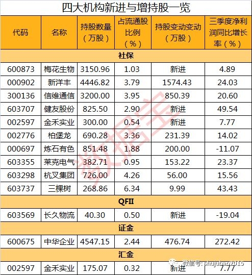 三季度机构最新持股动向:社保、QFII、证金、汇金新进增持这些股