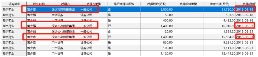 同样情况在和而泰身上。此次出面的是,深圳市高新投集团分三次,分别从8月23日、8月27日和9月19日,为股东曾少强办理了共计5600万元股份质押。