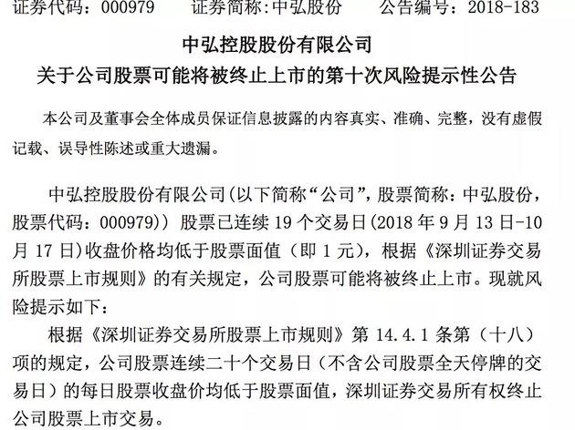 昨日晚间,中弘股份也发布了相关风险提示性公告。