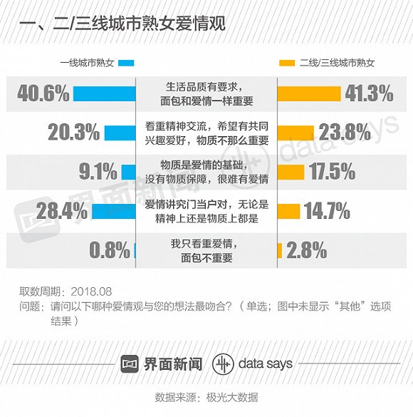 要爱情还是要面包,不同城市的熟女有不同的答案。与一线城市熟女相比,二/三线城市熟女更认同“物质是爱情的基础”,而一线城市熟女更认同“爱情讲究门当户对”。