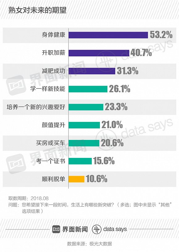 关于未来,熟女最主要的期望为身体健康、升职加薪和减肥成功,希望顺利脱单的熟女仅占10.6%。