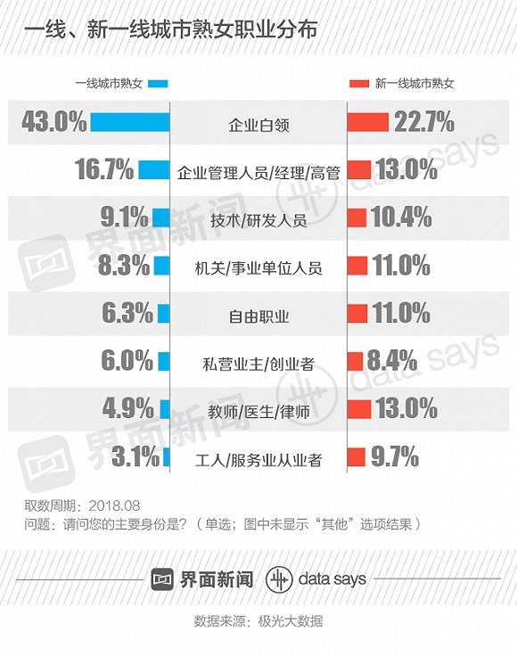 从职业分布上看,企业白领是熟女的首要职业选择。在一线城市中,超过四成的熟女都是企业白领。在新一线城市中,熟女也会考虑教师/医生/律师等职业。