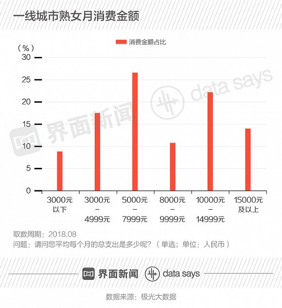 在一线城市中,超过半数熟女月消费超过8000元。同时,也有近一成熟女过着月消费3000元以下的生活。