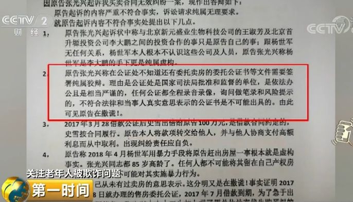 事情缘起于2016年12月,当时非常注重养生的张光兴老人,在被拉去听了几次北京新元盛业生物科技有限公司的讲座后,开始购买它们的保健品,并最终听信他们的蛊惑,在高额回报的诱惑下,用自己的房子做抵押向民间借贷公司贷款300万元进行了所谓的投资。