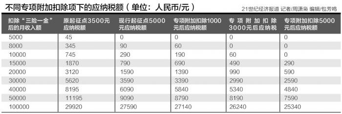 不同收入、不同负担的群体,将享有不同的减税额度。扣除“三险一金”后月入2万的群体,若能享有5000元/月的专项附加抵扣,每月将新增1000元的减税额度。