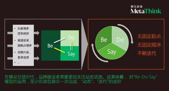 因为一个对于受众具有重要意义的符号能够自然地启动他脑海中的联想,包括形象化思维,并引起情感共鸣。企业在沟通中遵循一定的规律,就能够逐渐将自己想对受众说的化慢慢的沉淀到稳定的符号记忆中去。去年的论坛,我们讨论过一个Be-Do-Say三元的成长体系。也就是说,欲让别人真正记得你的特别之处,你首先得有一个身份, Be it就代表了你先对自己身份的观念与立场。有了这样的身份感,代表企业行为的Do和Say就有了一个基调。从而可以持续不断地输出你的信号。在快速迭代和更替的当下,Be-Do-Say在循环中不断相互影响,并不断地迭代。