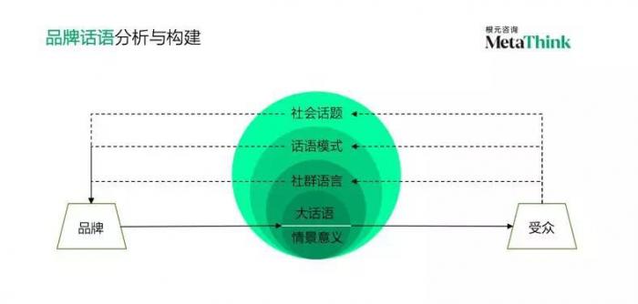 我们的经验表明,有效地创造品牌符号可以从文化战略和话语空间等视角进行分析研究,以能够真正有效地寻找到属于企业的品牌平台。以品牌话语分析为例,品牌在构建与目标受众的沟通时,往往需要从受众所关心的社会大话题出发来构建品牌的话语模式,并确定明确的受众策略以确定自己将要采用的社群语言,让自己与目标受众在价值观及表达方式上都更为融合,帮助品牌在于受众沟通时,获得最大程度的情感共鸣。