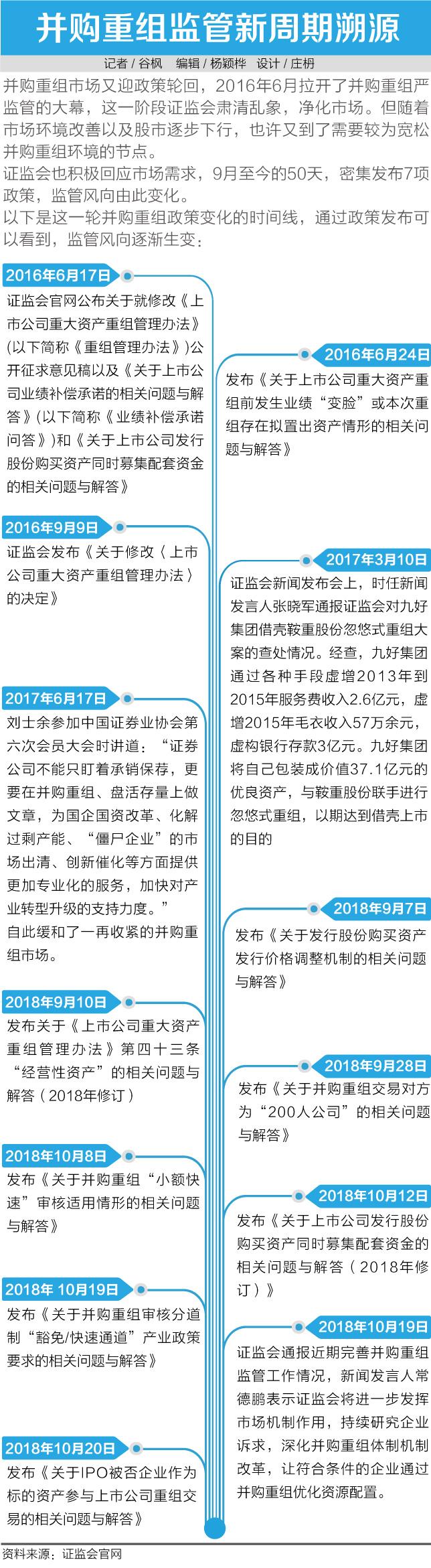 “当时监管层认为随着并购市场的发展,新的交易模式不断出现,规避监管套利的现象也有所增加且花样翻新,并购重组估值非理性程度较高。因此监管重点在规范上市公司重大资产重组行为和促进市场估值体系理性修复方面,可以说相比之前进入了一个新监管周期。”23日,一位申万宏源的分析师10月23日接受记者采访时认为。