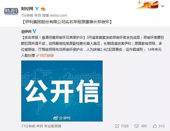 10月24日,伊利集团在自己官网和官方微博上发布举报文章,实名举报前董事长郑俊怀。