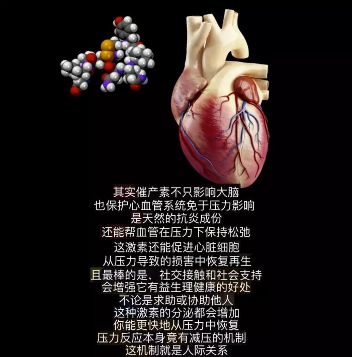 其实,我们的心脏有催产素受体,它能帮助心肌细胞再生,并从压力导致的损伤中得到恢复。催产素对于人体的这些好处来源于社交联系和人际支持。也就是说: