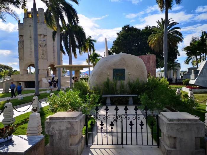 就墓地地形来看,与何塞·马蒂陵墓对称的左边有一块空地,按道理讲可以建一处与何塞·马蒂陵相同的陵墓,安放卡斯特罗的骨灰。但是没有,他的陵墓只是何塞·马蒂陵寝前的一块巨石,其简单令人感叹不已。