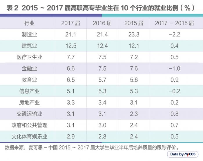 教育业和建筑业分别是本科生和高职高专生社会需求量第二大的行业。数据显示,在2017届本科生中,14.7%的人毕业半年后就业于教育业;在2017届高职高专生中,12.5%的人毕业半年后就业于建筑业。