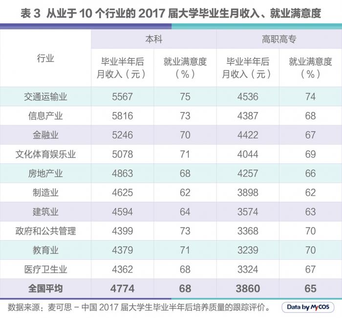 相比之下,2017届大学生毕业半年后就业于医疗卫生业(本科:4362元,高职高专:3324元)、政府和公共管理(本科:4399元,高职高专:3368元)、教育业(本科:4379元,高职高专:3239元),至少在就业初始阶段收入处于劣势。