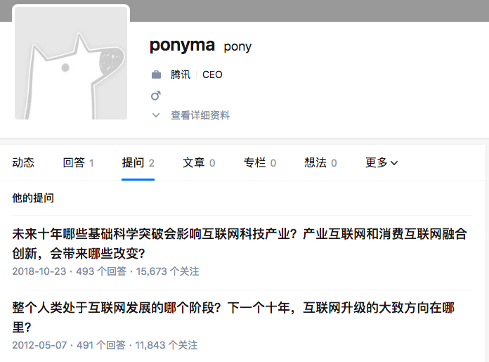记者了解到,马化腾在知乎上的足迹可以追溯到7年前,当时他关注了“微信”的话题。七年间,马化腾总共提过两个问题以及回答了一个问题。