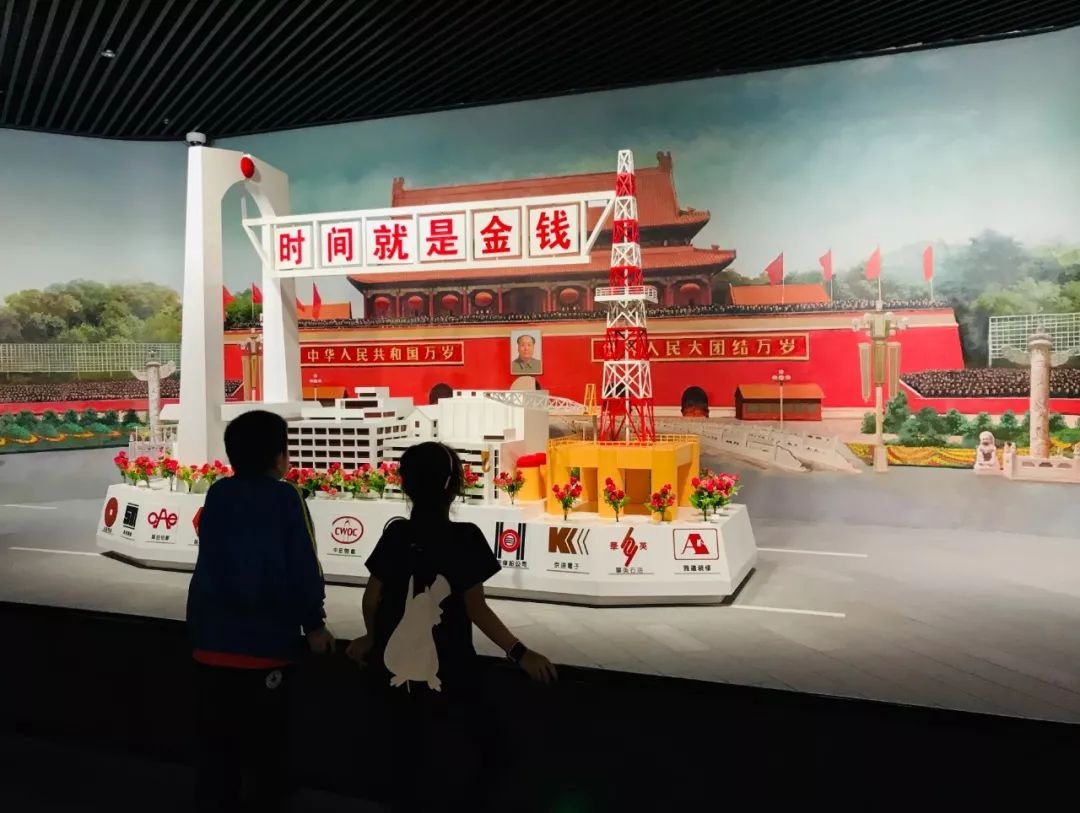 △1984年的国庆游行中,“时间就是金钱,效率就是生命”写上了这辆反映蛇口工业区建设成就的彩车。这一口号通过电视荧屏,传遍神州大地。(央视记者拍摄于中国改革开放蛇口博物馆。“时间就是金钱”与“效率就是生命”两则标语会交替出现。)
