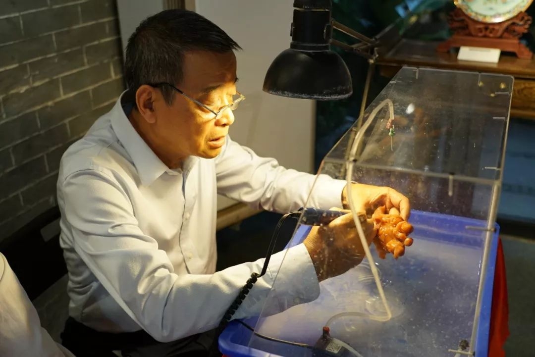 △广州玉雕国家级传承人高兆华正在用金丝玉雕刻《送子观音》(央视记者 沈忱拍摄)