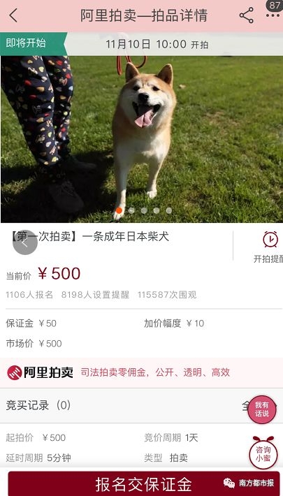 拍卖标的有点特殊:一只四岁的成年日本柴犬,身高40厘米左右,体长50厘米,体重十公斤左右,黄白色,未办理犬证,已绝育,已打疫苗。