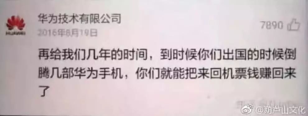 截图显示,华为官微写道,“再给我们几年时间,到时候你们出国的时候倒腾几部华为手机,就能把来回机票钱赚回来了。”