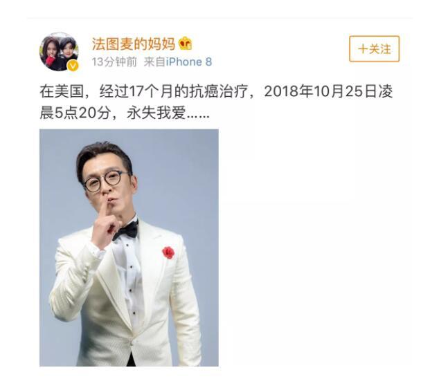 10月29日上午,哈文发文称丈夫李咏因病去世,她写道:“在美国,经过17个月的抗癌治疗,2018年10月25日凌晨5点20分,永失我爱。”