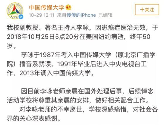 知名主持人李咏去世的消息传出后,央视新闻官微、中国传媒大学官微都发文悼念李咏。