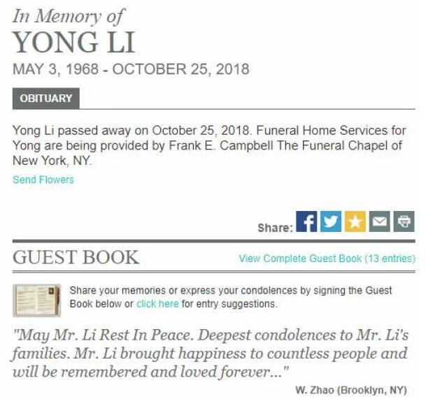 美国纽约当地殡仪馆网站显示的信息,李咏于当地时间10月25日过世。在网上追思留言里,一位来自布鲁克林的W. Zhao写道:愿李先生安息。向李先生家人致以最诚挚的慰问,李先生为世人带来欢乐,将永远被人铭记和爱戴。