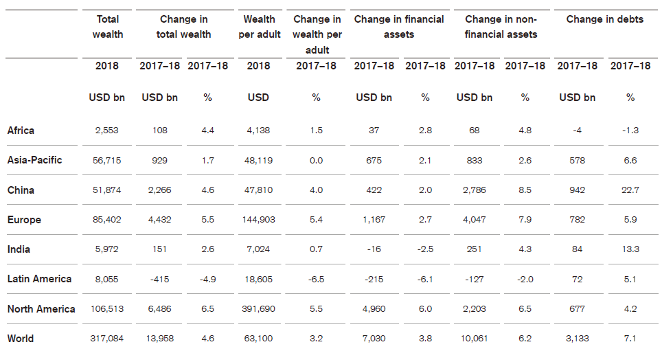 截至2018年年中,全球财富总额达到了317万亿美元,较上一年增长4.6%。虽然增长率不及2017年同期,但依旧高于2008年次贷危机后的平均水准。如果把人口增长水平算上,过去的一年里每个成年人财富增长约为3.2%,继续创出历史新高。与此同时,拉美地区是全球唯一一个财富总量下滑的地区。