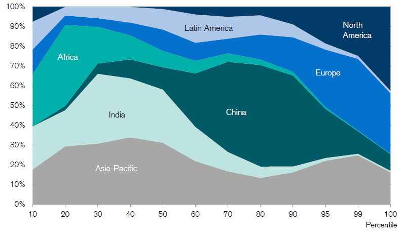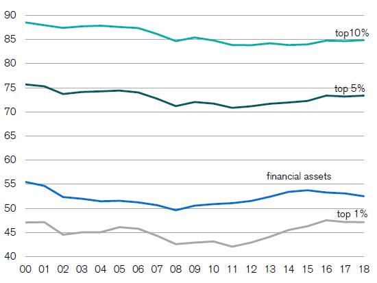 全球最有钱的人掌握全球财富的比例一直是媒体津津乐道的话题,不过瑞信指出这个比例自2000以后几乎就没有显著的变化,甚至在次贷危机之后还有所下降。截至2018年年中,全球最富有的10%拥有全球84.8%的财富,最富有的5%拥有全球73.4%的财富。瑞信特别指出,全球最富有1%人群的资产占全球财富的份额与金融资产占全球财富的份额高度相关。