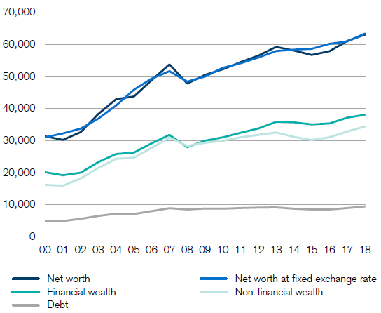 这一点从个人财富的成分中也能看出来,过去18年里全球人均财富翻了一倍,但绝大多数的财富增长来自于2000-2007年间。同时金融资产、非金融资产和负债的水平也保持着等比例的变化。
