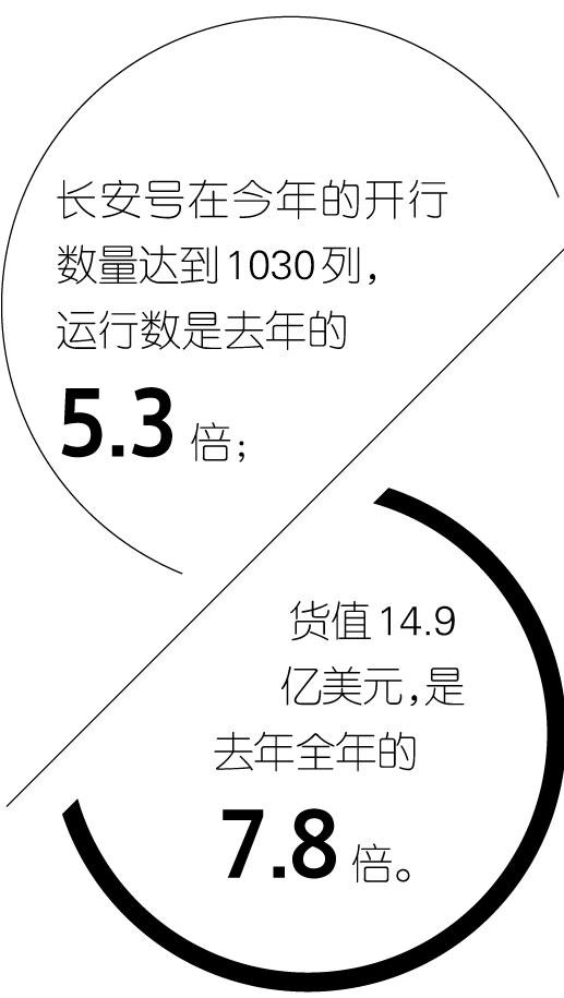来自西安国际港务区的数据显示,截至2017年12月底,长安号全年开行194列,运送货物总重约23.2万吨;而到了2018年10月30日,长安号在今年的开行数量达到1030列,运行数是去年的5.3倍;货值14.9亿美元,是去年全年的7.8倍。