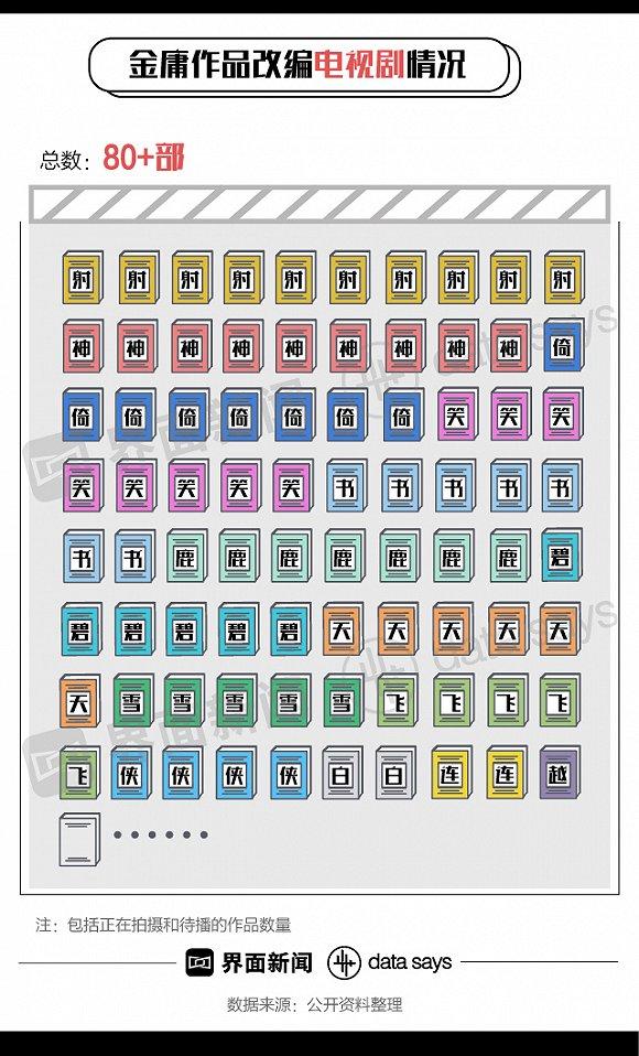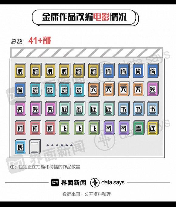 金庸的武侠小说对整个华人世界的影响极大,即使你没看过小说原作,也一定看过由武侠小说改编而来的影视作品。据界面数据(公众号ID:tuli_shuju)不完全统计,金庸的作品至少被改编成41部电影和80部电视连续剧。其中改编次数最多的是《射雕英雄传》,被改编成过6部电影和10部电视剧。