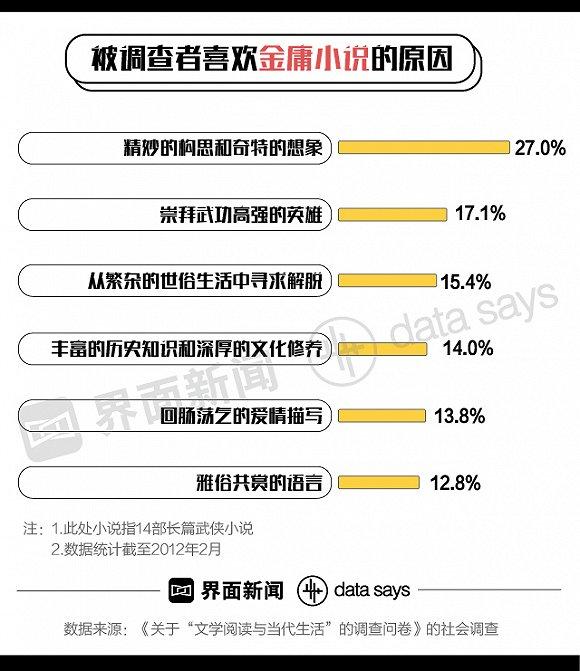 人们喜爱阅读金庸小说的首要原因是金庸“精妙的构思和奇特的想象”,其次是因为“崇拜武功高强的英雄”。