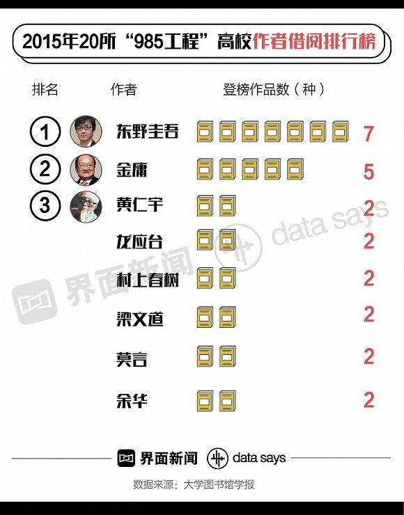 同时,金庸在20所985高校作者借阅排行榜上排名第二,登榜作品数达到5种。