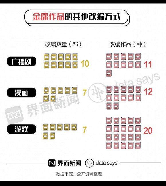 金庸作品还被改编成广播剧、漫画、游戏等形式。据界面数据(公众号ID:tuli_shuju)不完全统计,根据金庸作品改编的广播剧、漫画、游戏至少分别有11种、12种和20种。游戏中还包括中国唯一连续运营20余年的网络游戏《北大侠客行》。