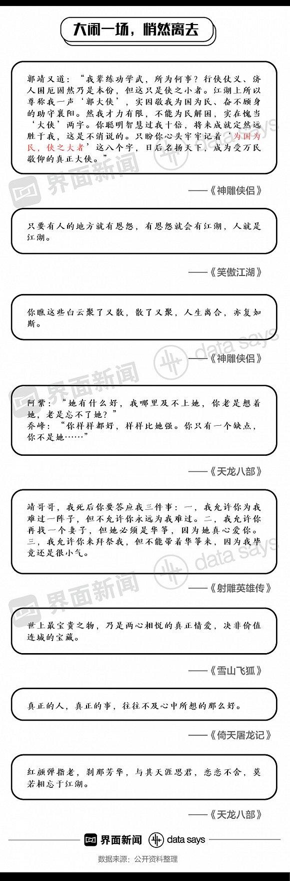 金庸作品及相关影视改编作品中不仅出现了许多英雄、佳人、侠客、浪子,也涌现出许多名言,或感人或励志或洞彻,影响了一代又一代人。