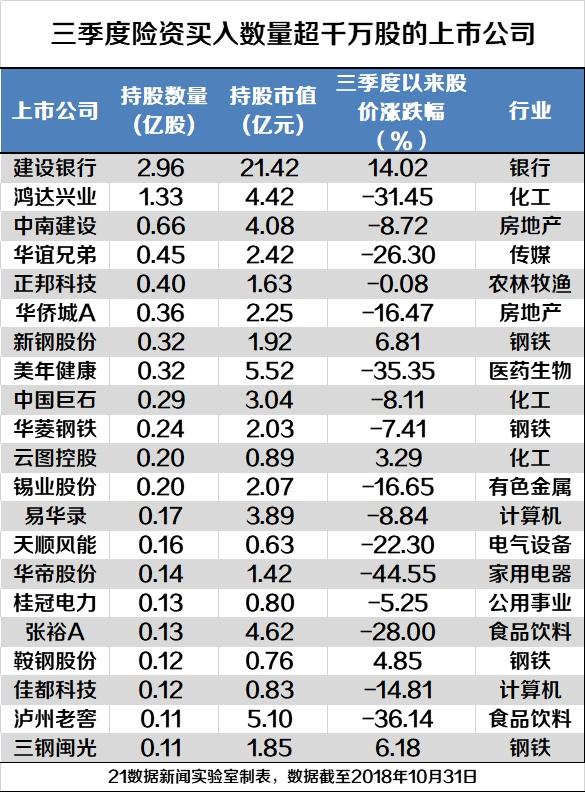 据21数据新闻实验室统计,截至三季度末,保险资金出现在434家上市公司前十大流通股东中,持股市值约为1.11万亿元,相比二季度末增加约400亿元。