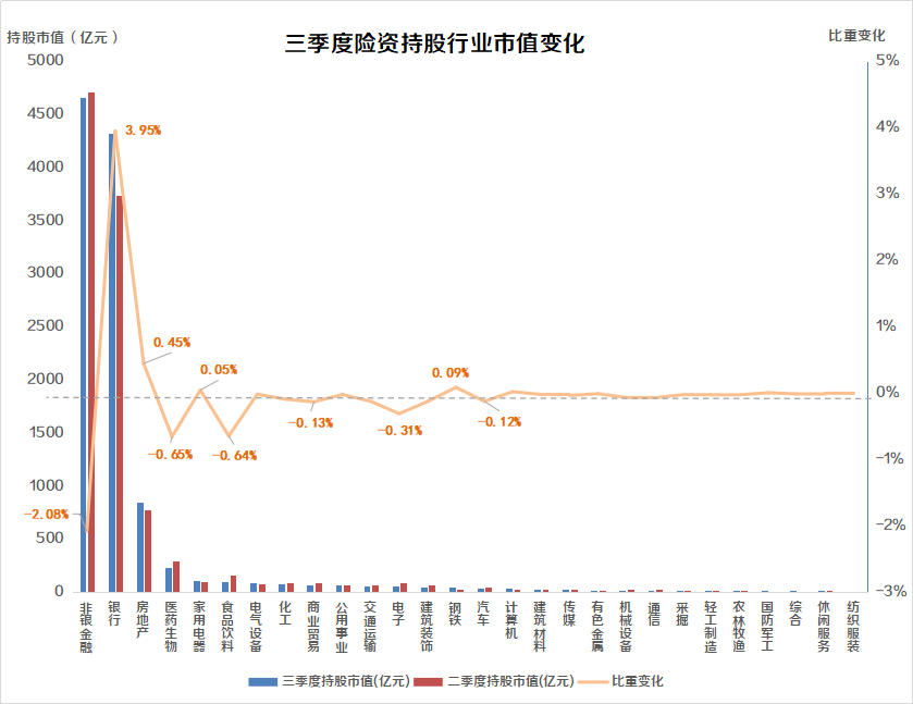 从环比数据来看,银行、房地产、钢铁等持股比重提升最多,截至三季度末,险资持有银行股市值约占险资所有持股市值的39%。