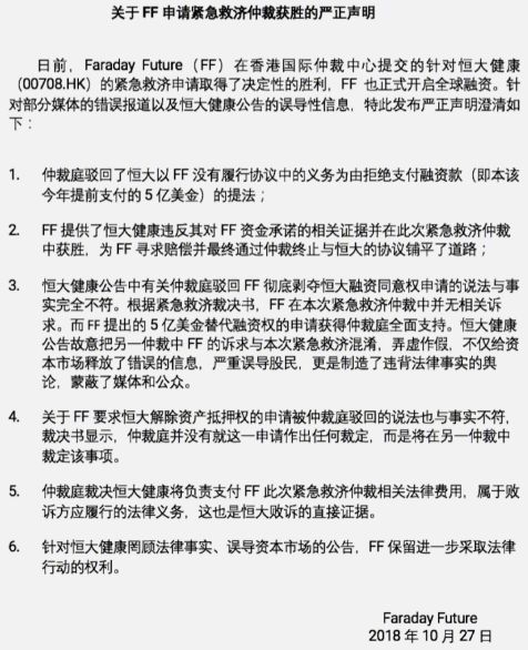 最新的仲裁结果显示,FF可以开放全球融资,但有严格限制条件:价格不能低于恒大购买其股份的价格,且融资额不能超过5亿美元。这也使得FF在进行下一轮融资时变得更为艰难。