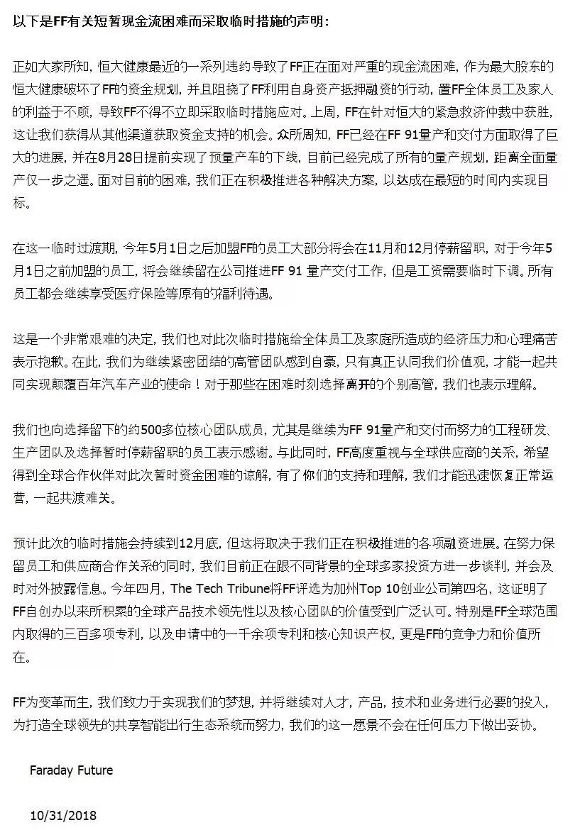 FF声明:保留500核心员工
