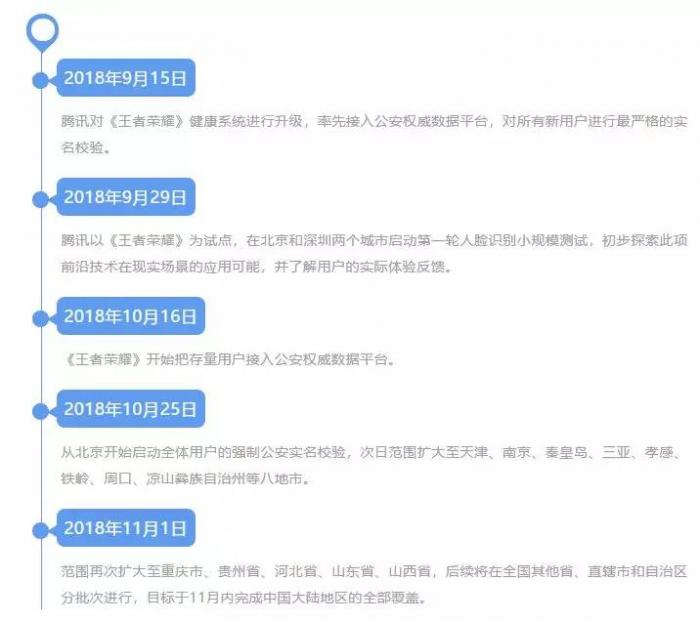 中午,腾讯官方微信推送文章,公布其防沉迷工作进展。表示截至目前,腾讯已在北京、天津等地启动了《王者荣耀》用户强制公安实名校验的工作,11月内完成中国大陆地区的全部覆盖。